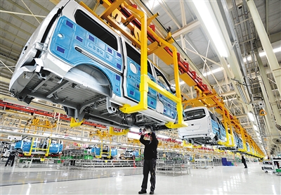 图为工人在北汽集团河北黄骅分公司总装车间生产线上工作。