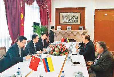 郭卫民(左二)向哥伦比亚自由党政要介绍中共十八届六中全会精神。