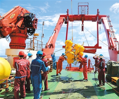 中国远洋综合考察船“科学”号正在西太平洋执行潜标观测网维护与升级任务。截至目前,科考队员已获取了140余件观测设备连续1年的现场数据,维护了8套深海潜标,并重新布放至西太平洋海域。图为科考队员在回收观测设备。