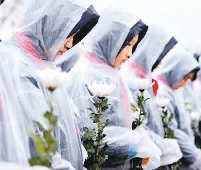 12月13日,在中山码头遇难同胞纪念碑前,人们手持菊花默哀。