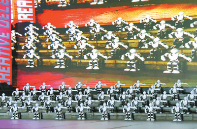 图为在第12届“创意十二月”开幕式上,深圳企业生产的“阿尔法机器人”登台炫技。