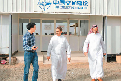 图为2015年2月12日,中国中交集团沙特公司的中外员工在沙特吉达市防洪渠项目指挥部门前交谈。