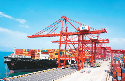 在斯里兰卡科伦坡南港码头,一艘集装箱船正在装卸货物。科伦坡南港码头是中国和斯里兰卡共建“21世纪海上丝绸之路”对接标杆项目。