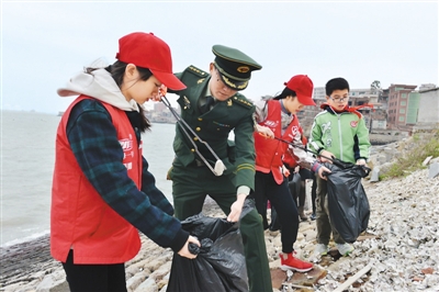 福建泉州泉港区沙格边防派出所、肖厝小学、泉港义工协会近日联合举行“同守碧海良港,共护美丽家园”环保志愿活动。图为志愿者在肖厝港清理岸边废弃物和海漂垃圾。