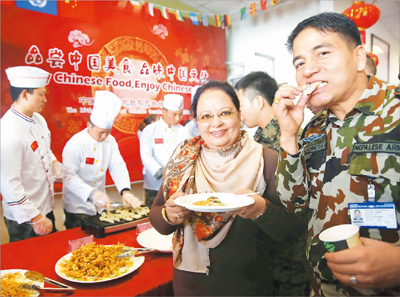 图为尼泊尔少校迪内希(右)和妻子在中国美食展区前品尝美食。