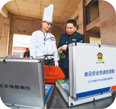 12月17日,湖南省长沙市望城区食品安全管理办公室工作人员对新型环保流动餐车进行食品安全检测。