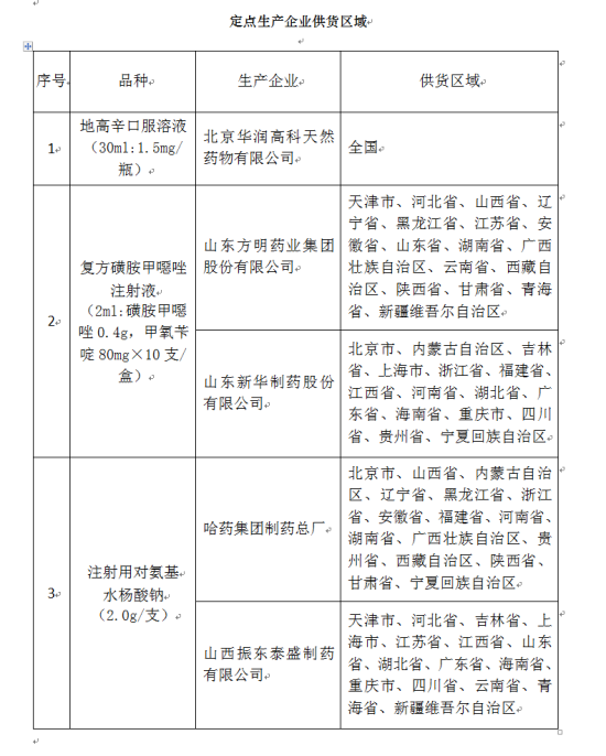 2016年临床必需、用量小、市场供应短缺药品定点生产试点的3个品种及中标企业如下(各中标企业指定供货区域见附件1):