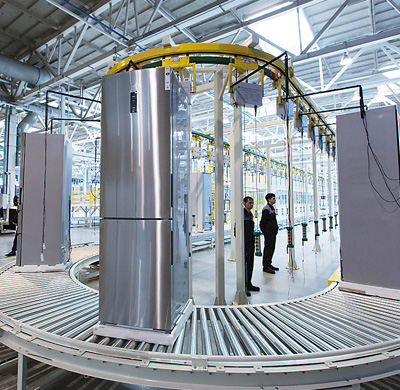 图为2016年4月22日在俄罗斯卡马河畔切尔尼市拍摄的海尔冰箱功能动态检测线。当日,中国家电品牌海尔在俄罗斯鞑靼斯坦共和国卡马河畔切尔尼的冰箱制造基地正式投产运营。