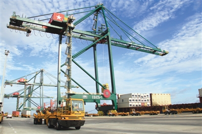 图为2016年10月12日在多哥首都洛美拍摄的洛美自治港集装箱码头。中国制造的巨型吊车正夜以继日地调配、转运来自世界各地的货物。
