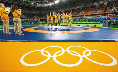2016年8月18日,在巴西里约奥运会摔跤场馆内,场馆工作人员和志愿者在摔跤垫上拍照。本届奥运会的摔跤垫来自中国山东泰山体育集团。作为四届奥运会器材供应商,泰山体育在本届奥运会上为11个大项提供了近万件器材。