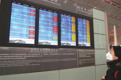 2016年12月20日,一位旅客在首都机场T3航站楼查看航班延误状况。