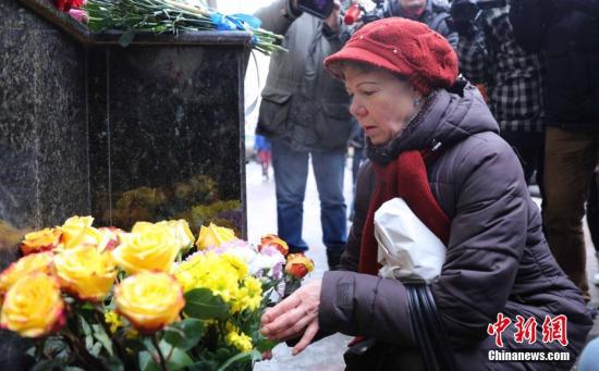 当地时间12月25日,俄罗斯民众在亚历山德罗夫红旗歌舞团门口为图—154空难遇难者献花。 中新社记者 王修君 摄