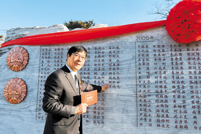 12月28日,北京“劳模墙”在明城墙遗址公园落成。“劳模墙”上镌刻了1949年至今北京市的1197名全国劳模的名字。图为全国劳模解黔云在“劳模墙”前留影。