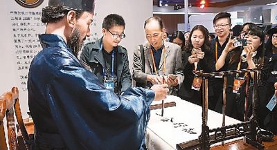 图为海交会上一款会写毛笔字的机器人吸引了与会者的目光。