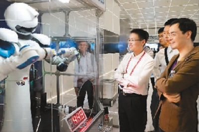 图为博士们参观美的集团股份有限公司全球创新中心展厅,一款会转魔方的机器人让他们久久驻足。