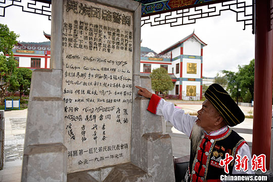 中新网普洱5月24日电 (记者 保旭 史广林)5月的宁洱县,满城的凤凰花犹如凤凰涅槃,鲜艳如火。87岁的方有富站在民族团结誓词碑前,不停地念叨着,“没有民族团结,哪有现在的好日子。”这块“新中国民族团结第一碑”和“新中国民族工作第一碑”承载了太多的故事。