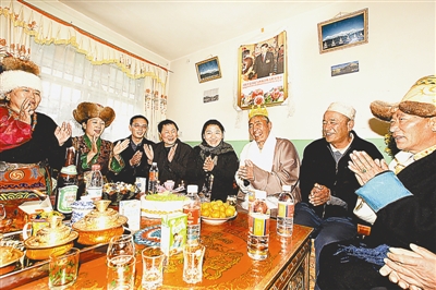 大院居民索朗旺堆老人迎来65岁生日,邻居们带着生日礼物前来祝寿。