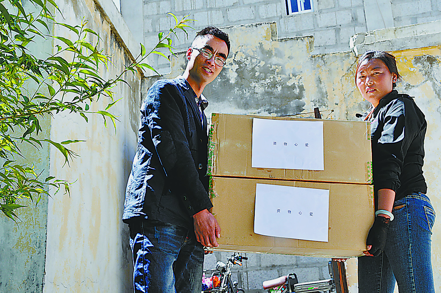 这对夫妻在搬运爱心物资。记者 王杰学 摄