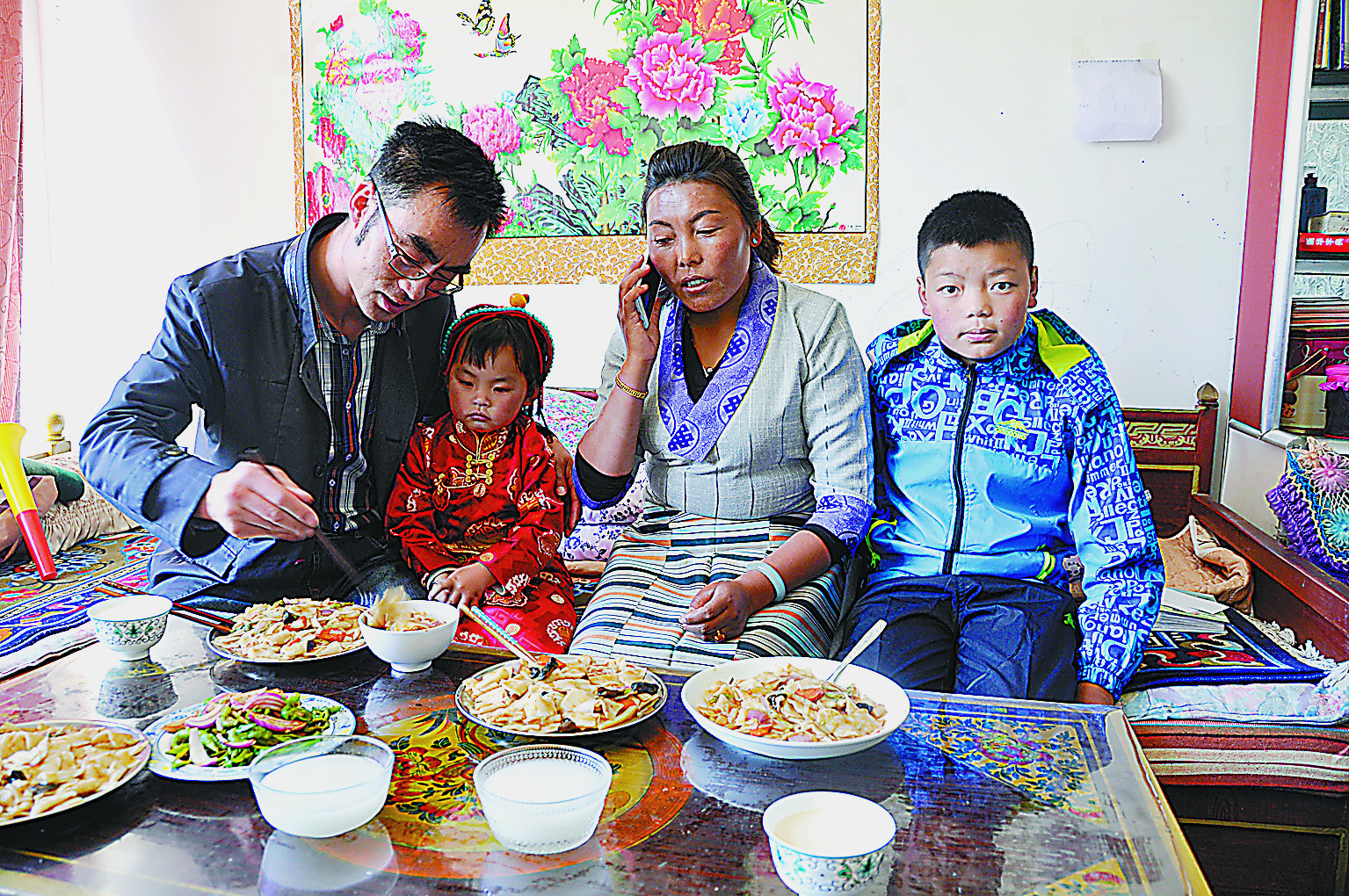 庞海军一家人在家里用餐。 记者 王杰学 摄