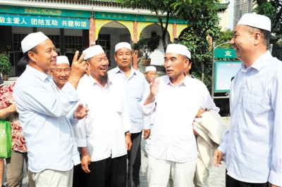 银川市金凤区新城清真大寺的回族群众热议被总书记接见时的场景。记者 丁建峰 摄