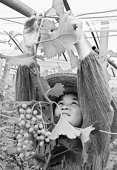 近年来,广西罗城仫佬族自治县积极调整特色产业结构,因地制宜,以毛葡萄为重点,大力实施“优果工程”,促进农民增收。目前,全县水果种植面积近12万亩,预计今年全年水果产量超5万吨,总产值达1.5亿元。图为果农在大棚葡萄园里绑苗上架。