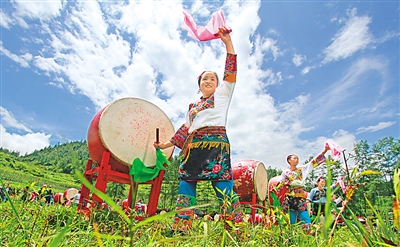 8月7日,湖南省花垣县苗族迎来“赶秋节”。当地苗族同胞穿着漂亮的民族服饰,打苗鼓、舞龙灯、唱苗歌,庆祝五谷丰登的好年成。图为双龙镇卧大召村苗族群众在打苗鼓。