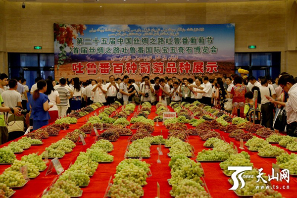天山网讯(记者金佐坤摄影报道)8月20日上午,第二十五届中国丝绸之路吐鲁番葡萄节暨首届丝绸之路吐鲁番国际宝玉奇石博览会(以下简称石博会)在吐鲁番宝玉奇石博览中心开幕。