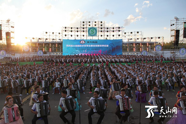8月20日晚,在新疆塔城市演艺场,1517人合奏手风琴演绎曲目《塔尔巴哈台》,创造了新的最大规模手风琴合奏吉尼斯世界纪录。