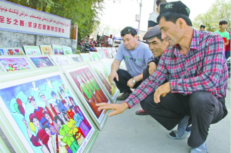 新疆日报讯(记者华岩明摄影报道)8月29日,农牧民在观看察布查尔锡伯自治县海努克乡巴扎日展出的“民族团结一家亲”农民画展。据悉,这次展出的48幅农民画均出自农牧区民间艺人之手,作品内容主要反映了边疆各族人民“爱国爱疆、团结奉献、勤劳互助、携手脱贫和共同致富”的精神面貌。