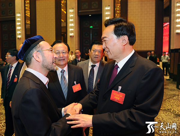 茶话会前,陈全国等自治区领导与各族各界代表亲切握手、互致祝福。