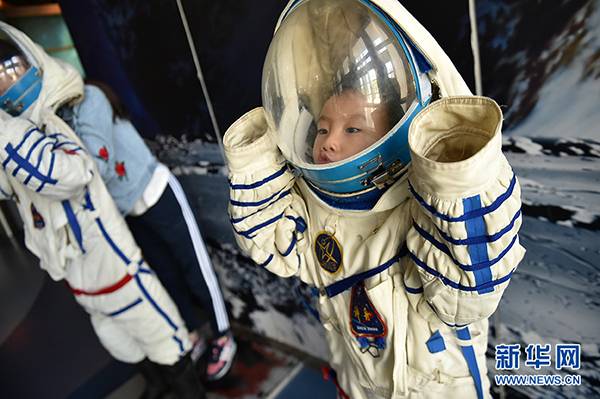 10月7日,小朋友在宁夏科技馆试穿“宇航服”