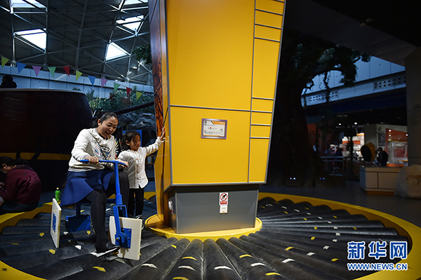 10月7日,在宁夏科技馆,家长带着小朋友体验“方轮车”。