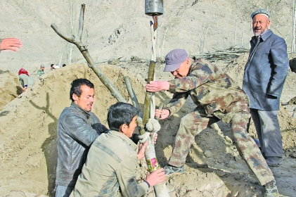 除了这条“惠民渠”,工作组还在该乡库西塔格村修了一条“富民渠”。这条“富民渠”以前因年久失修,渠道多处坍塌、石块堆积、引水能力下降,导致该村灌溉期村民田地水源严重不足,仅去年一年,就造成200多亩地大幅度减产,村民只能望“渠”兴叹。工作组得知情况后,立即和村两委一起实地查看水渠现状,定方案、联系施工机械,经过两天不停歇的施工,全长3.8公里的水渠疏通了。“村里的核桃树、杏树的水源有了保障,今年我们村要大丰收了。”村民们高兴地说。