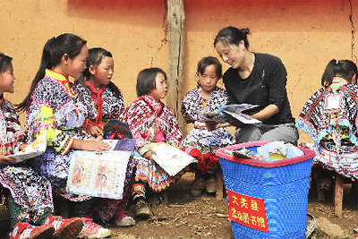 日前,云南省昭通市大关县“背篼图书馆”走进该县悦乐镇新街村海坝苗寨。大关县位于乌蒙山腹地,一些村子不通公路,山势陡峻,有的山路连马都很难行走。为了确保贫困偏远山区群众和留守儿童享受文化惠民成果,大关县文化体育广播电视和旅游局开展文化扶贫,今年7月12日成立了“背篼图书馆”送书服务工作队。