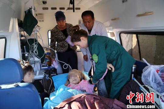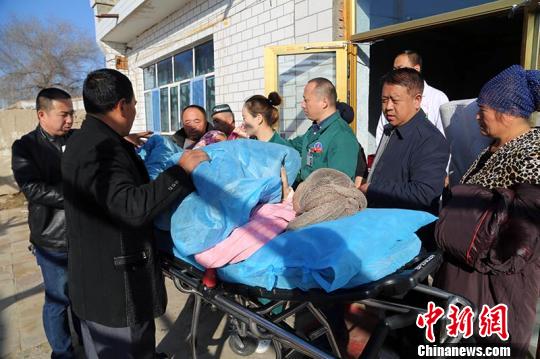 吉木萨尔医院医护人员到祖然古丽·塔西普来提家中接她,前往乌鲁木齐接受治疗。 甄梓妤 摄