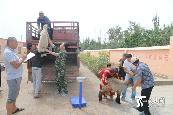 工作队配合企业给通过企业加农户养殖模式扶贫的特困户称重发羊。