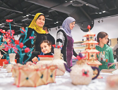 由开罗中国文化中心及甘肃省文化厅共同主办的“甘肃文化周”活动,12月2日晚在埃及首都开罗歌剧院拉开序幕。除了歌舞表演,开幕式现场还举行了甘肃数字文物展和非物质文化遗产展。图为当地群众参观非物质文化遗产展。
