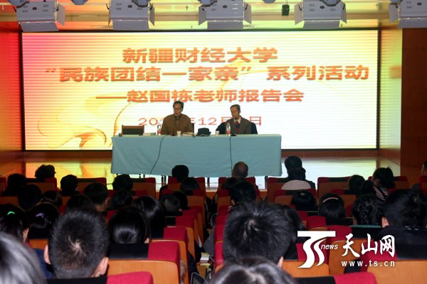 当天下午,新疆财经大学举行“民族团结一家亲”系列活动——赵国栋报告会。赵国栋向参会者分享了自己与维吾尔族诗歌“柔巴依”的故事,并向大家朗诵了“柔巴依”。很多教师学生听闻赵国栋作报告,纷纷来到会议室,一睹赵国栋的风采。