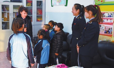 近日,努尔斯曼古丽·肉孜(左一)和同事一起来到第87中学,与该校孩子们开展结对帮扶活动。(受访者供图)