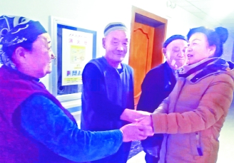 吴淑芹(右一)与敬老院的各族老人寒暄。