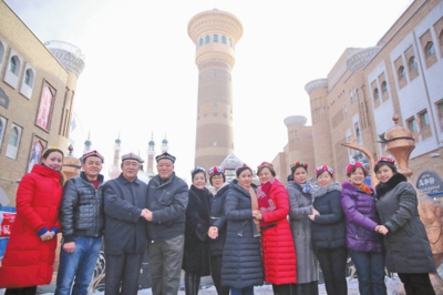 12月28日,乌鲁木齐市固原巷社区居民和翠泉东社区结对认亲亲人在新疆国际大巴扎拍照。