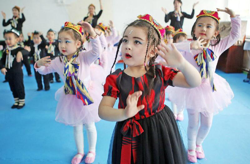 新疆经济报讯(记者李瑞摄影报道)12月27日,乌鲁木齐市第一幼儿园举行了民族团结幼儿体操比赛,通过比赛加深了各族小朋友间的友谊。小朋友穿戴民族服饰,和着音乐或拍手或跳跃,憨态可掬。图为小4班的小朋友正在表演《维吾尔族舞蹈体操》。