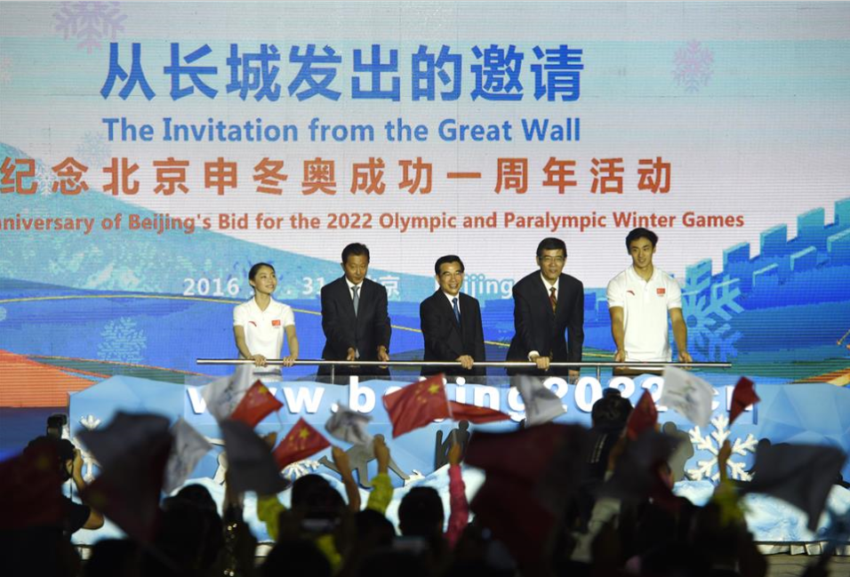 7月31日,北京冬奥组委执行主席、北京市市长王安顺(中)与嘉宾及运动员代表一起发布北京2022年冬奥会和冬残奥会组织委员会官方网站。当日,在北京成功申办2022年冬奥会一周年之际,北京冬奥组委在长城脚下举办“从长城发出的邀请”活动,面向全球征集2022年冬奥会会徽和冬残奥会会徽设计方案。与此同时,北京2022年冬奥会和冬残奥会组织委员会官方网站正式上线。新华社记者鞠焕宗摄
