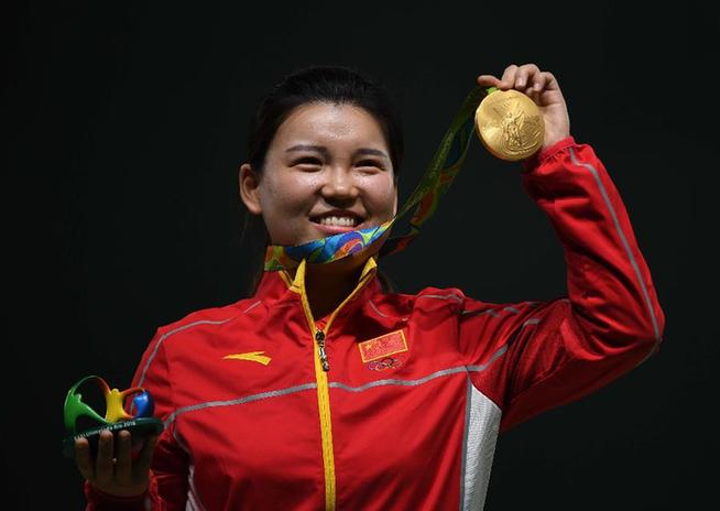 8月7日,张梦雪在颁奖仪式上展示金牌。当日,在2016年里约奥运会射击女子10米气手枪决赛中,中国选手张梦雪以199.4环的成绩夺得金牌,为中国代表团摘得本届奥运会首金。新华社记者韩瑜庆摄