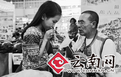 在5号馆的临沧展台内,一个年轻的傣族姑娘正在造纸,引来不少人围观。据了解,这种纸的原材料是一种名叫构树的皮,完成一张纸要经过采料、晒料、浸泡、拌灰、蒸煮、洗涤、捣浆、浇纸、晒纸、砑光、揭纸共11道工序。