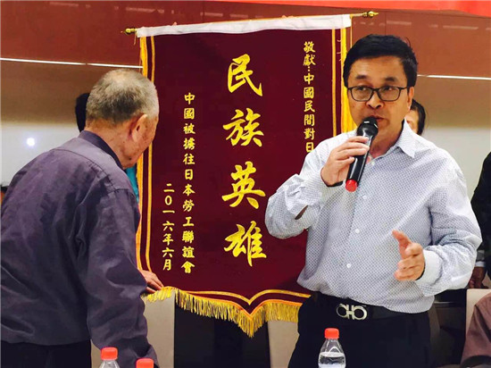 中国劳工代表向童增赠送“民族英雄”锦旗,他坚辞不受,他说功劳应该属于全体中国人民。 佚 名/摄