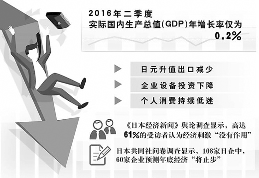 日本内阁府8月15日公布的数据显示,由于日元升值导致出口减少,加之企业设备投资下降,个人消费低迷,日本2016年二季度实际国内生产总值(GDP)年增长率为0.2%,低于预期。实现“安倍经济学”提出的2%通胀率和实际GDP增长2%目标依然遥遥无期。