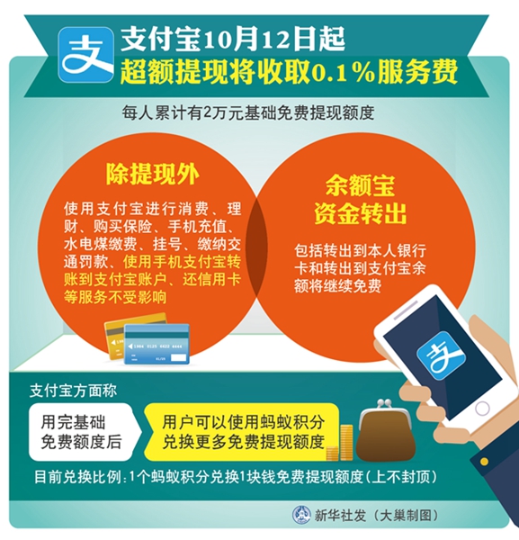 图表:支付宝10月12日起超额提现将收取0.1%服务费 新华社发 大巢制图