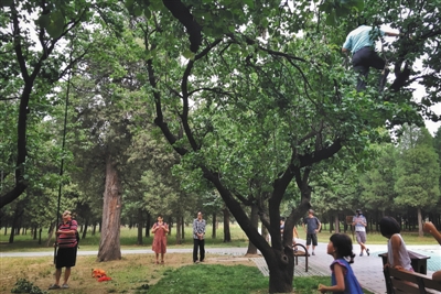 6月9日,天坛公园,有市民爬树摇树干摘杏。新京报记者 王嘉宁 摄