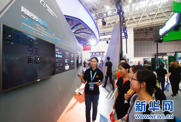 9月19日,2016国家网络安全博览会阿里巴巴展台内,工作人员给观众讲解网络安全知识。新华社发(程辉摄)